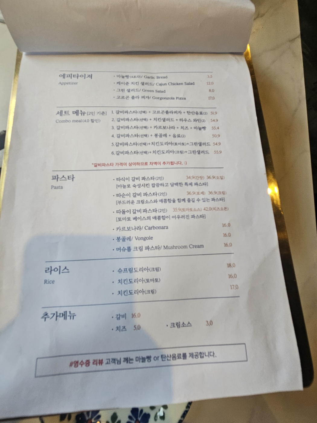 참! 갈비파스타는 2인분이 기본 가격으로 되어 있어요. 근데 남자 두명이 먹기에는 양이 부족했어요.