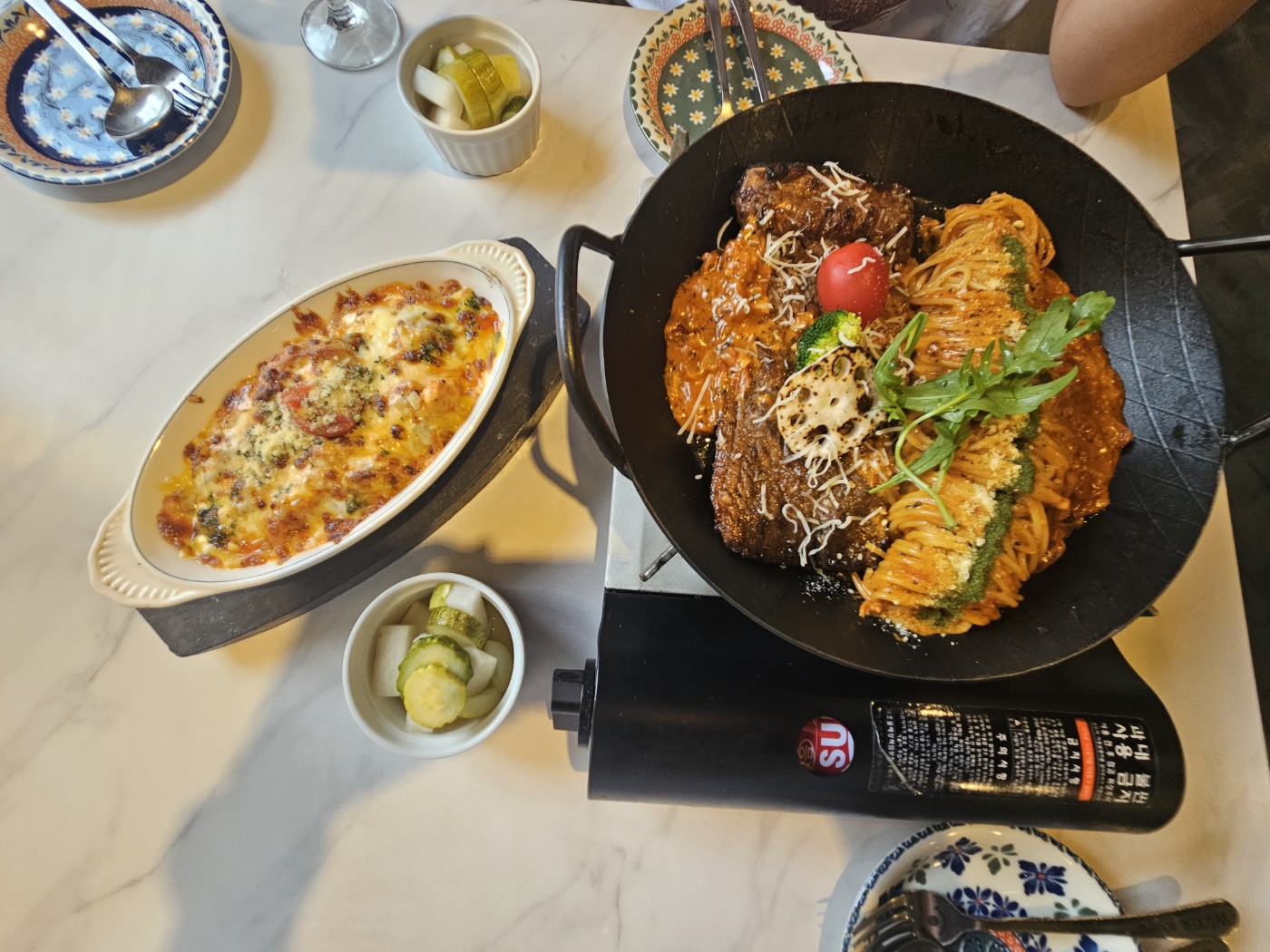 진한 로제소스에 부드러운 갈비가 크게 들어가 있어 식감과 풍미 모두 만족스러웠어요. 고소하면서도 매콤한 소스가 면에 잘 배어 있었고, 플레이팅도 깔끔했어요. 갈비파스타는 버너위에 올려서 주는데요~ 끝까지 따뜻하게 먹을 수 있어 좋았어요. 느끼하지 않고 매콤한 맛! 갈비의 부드러움의 조합이 꽤~ 인상적이었어요.